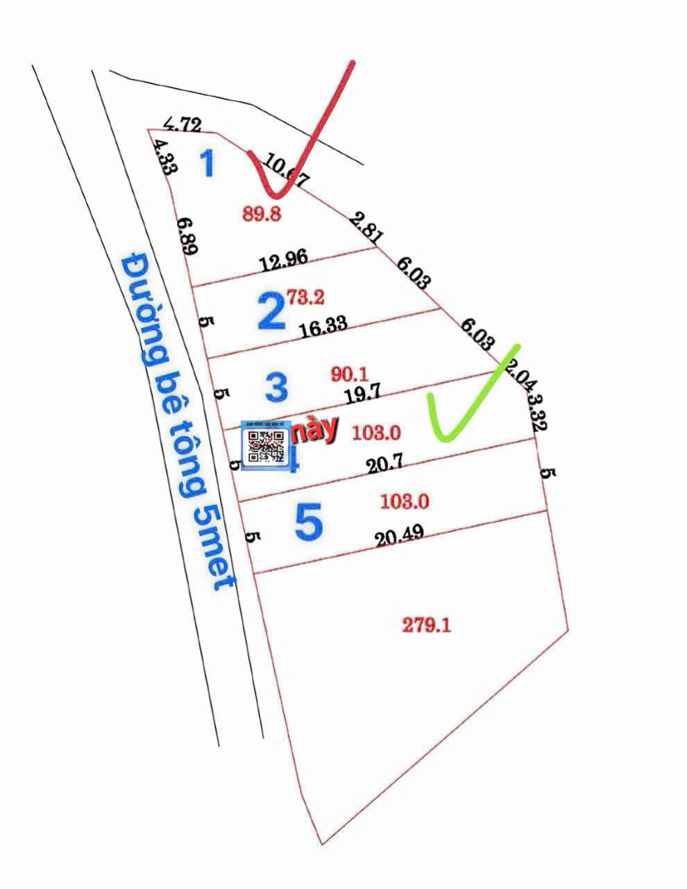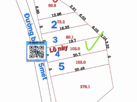 - Diện tích: 103m² full thổ cư (ngang 5m x dài 20m).