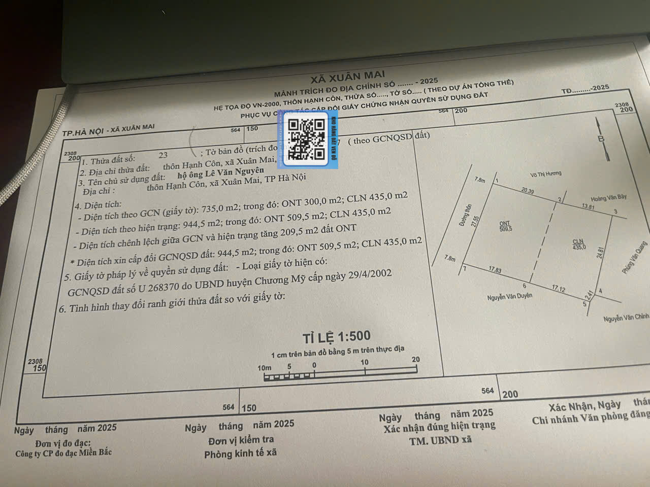 Trong đó có 509,2m² thổ cư, còn lại 435m² đất CLN